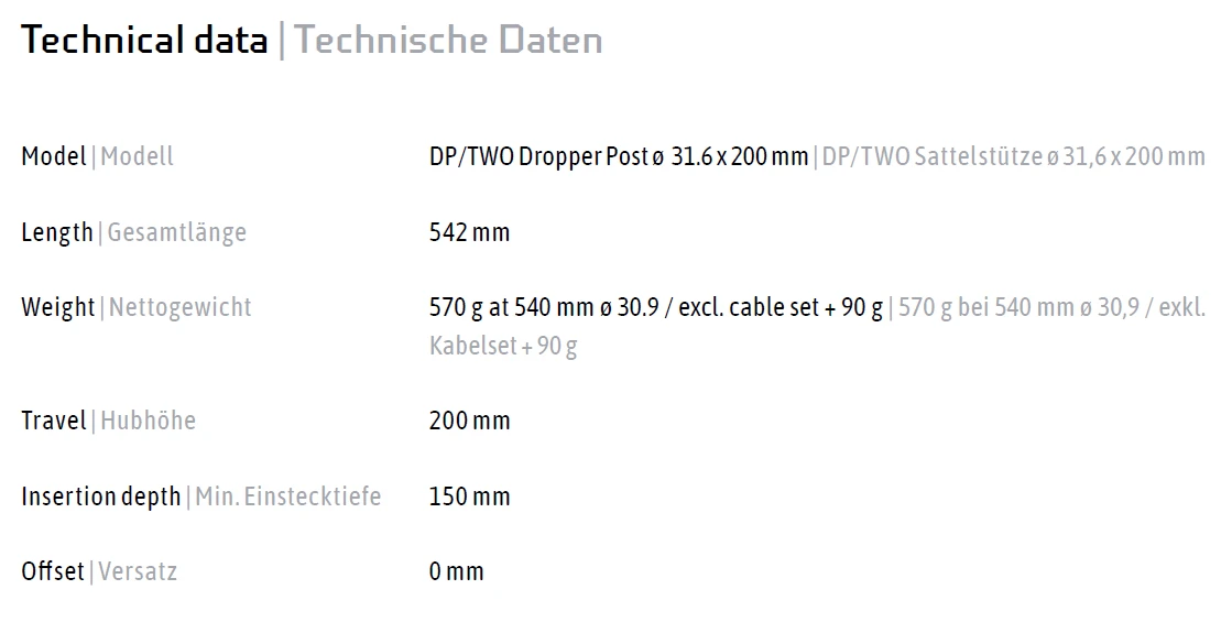 Afgezien daarvan heeft de DP/TWO dezelfde kenmerken: De hydraulisch verstelbare zadelpen heeft een afstandsbediening waarmee de zitpositie zonder gereedschap eenvoudig en comfortabel aan het betreffende terrein kan worden aangepast. De betrouwbare en robuuste technologie biedt een eenvoudige en precieze hoogteverstelling, vrijwel zonder speling, en maakt zo een snelle verandering van de zitpositie mogelijk. Het zadel kan worden verhoogd of verlaagd tot elke positie binnen het verstelbereik van de zadelpen.