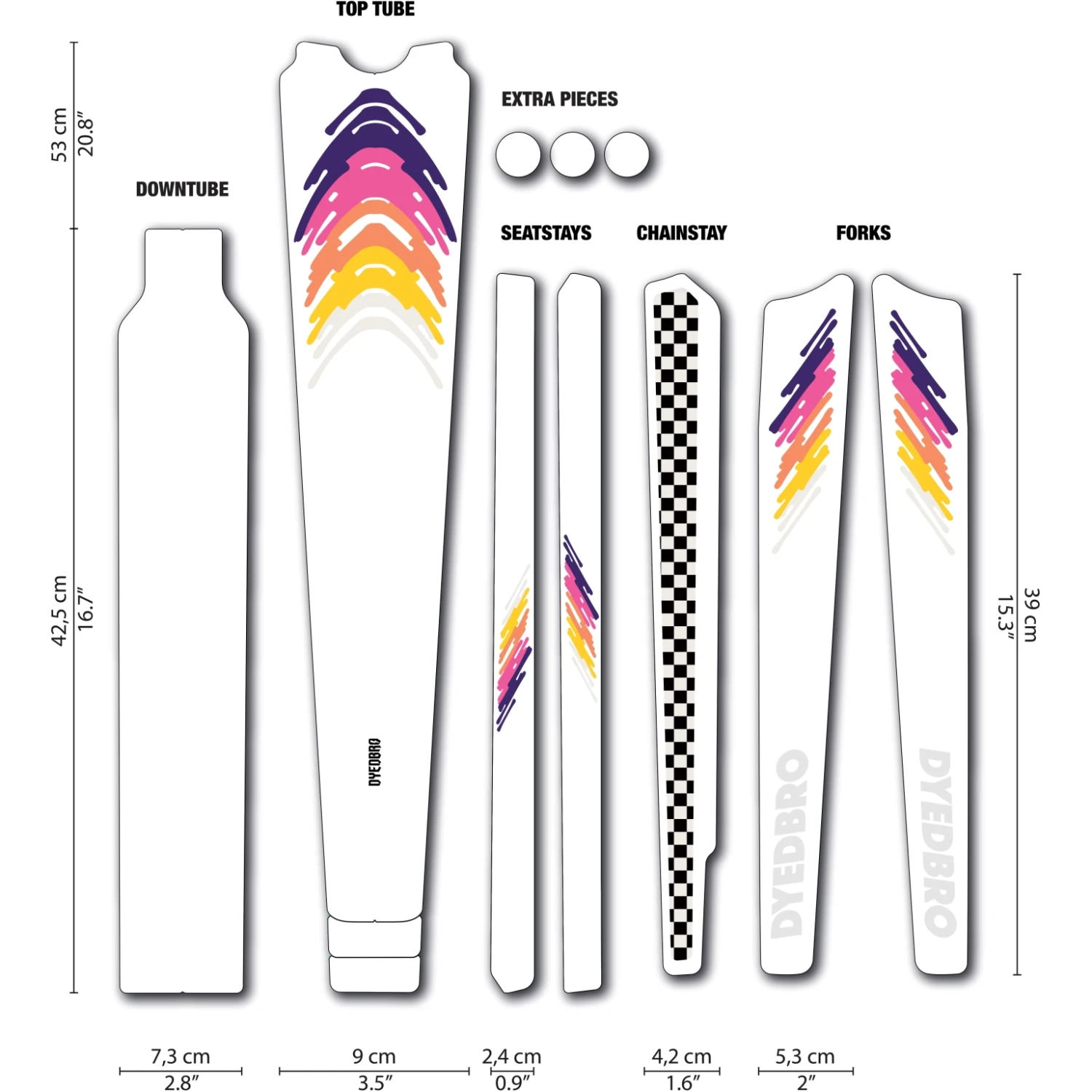 Ontworpen om de bovenbuis, onderbuis, vork, seatstays en chainstays te beschermen met in totaal 12 onderdelen.