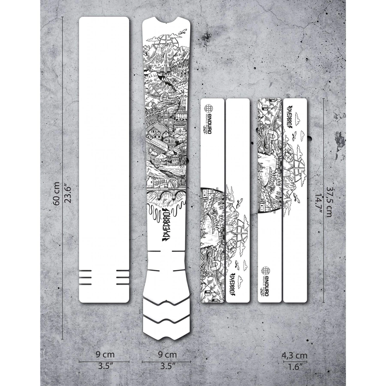 Dit unieke ontwerp van de Schotse kunstenaar Stormstatic toont alle stopplaatsen van het EWS-seizoen 2021 in het zwart. De beschermer is volledig transparant, zodat hij de kleur van uw fiets niet aantast.