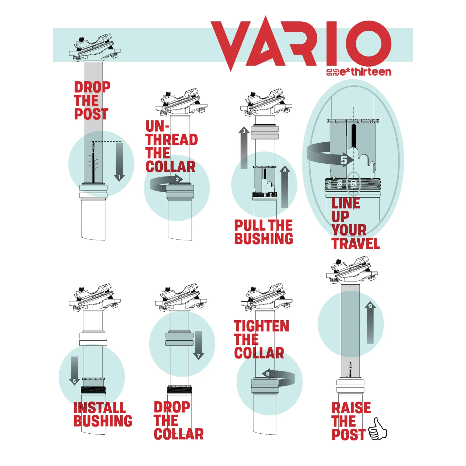 Om de slag traploos te kunnen aanpassen, schakelt e*thirteen bij de Vario telescopische zadelpen over op een luchtdruksysteem. Zelfs met kleine aanpassingen aan de hardware kan de beperking van de slag binnen een bereik van 30 mm worden geconfigureerd. Bovendien kon de vereiste drukkracht met 20% worden verminderd in vergelijking met concurrerende modellen.