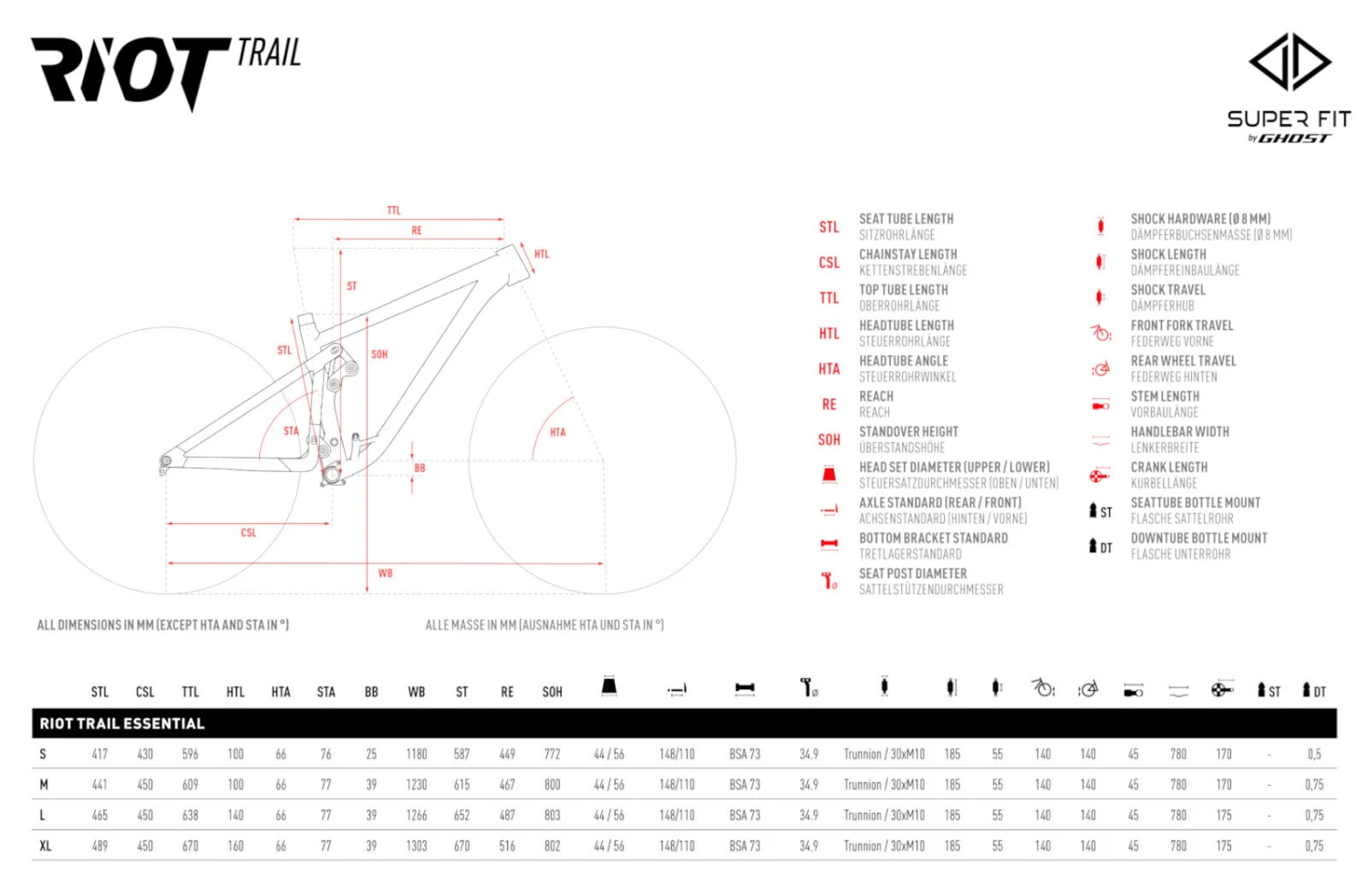 GHOST luidt een nieuw tijdperk in voor de ontwikkeling van fietsen en neemt afscheid van traditionele constructiemethoden. Voortaan worden de fietsen ontworpen met behulp van een speciaal ontwikkeld algoritme voor de holistische berekening van de zogenaamde “van-rijder-tot-fiets-geometrieën”. Dit algoritme heet SuperFit. Volgens het SuperFit-concept wordt maat S geleverd met 27,5″ wielen, terwijl de maten M-XL zijn uitgerust met 29″ wielen.